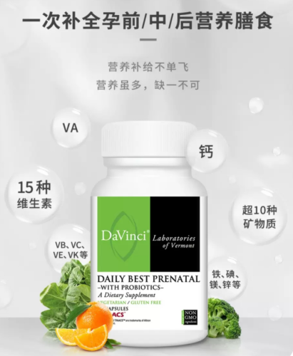 DaVinci達芬奇實驗室產(chǎn)前/哺乳復合維生素膠囊含有維生素、礦物質(zhì)和微量元素,能更好的促進營養(yǎng)素的吸收。滿足妊娠期婦女對維生素、礦物質(zhì)和微量元素的額外需求,預防妊娠期因缺鐵和葉酸所致的貧血、新生兒出生缺陷,降低不良妊娠結(jié)局的發(fā)生的概率。