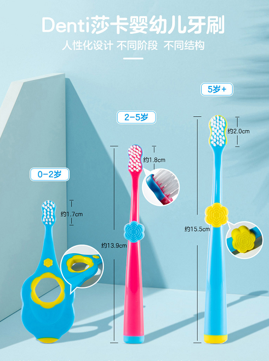 Denti 莎卡針對寶寶不同階段的口腔護(hù)理需求,推出了適合萌牙期、乳牙期、換牙期的三把分階段牙刷。